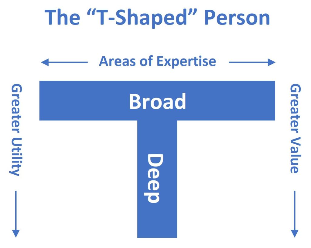 However, this diversity of talent also means each of us has an area where we can be more useful — where we are able to contribute more utility to an effort. The best visualization of this concept is perhaps the “T-shaped” person, a recruiting metaphor first popularized in the 1990s. This suggests that the ideal employee should have two types of skills: deep expertise in one particular area (represented by the vertical leg in a capital “T”), as well as a broad basic understanding of other related areas and how everything works together (represented by the horizontal bar).